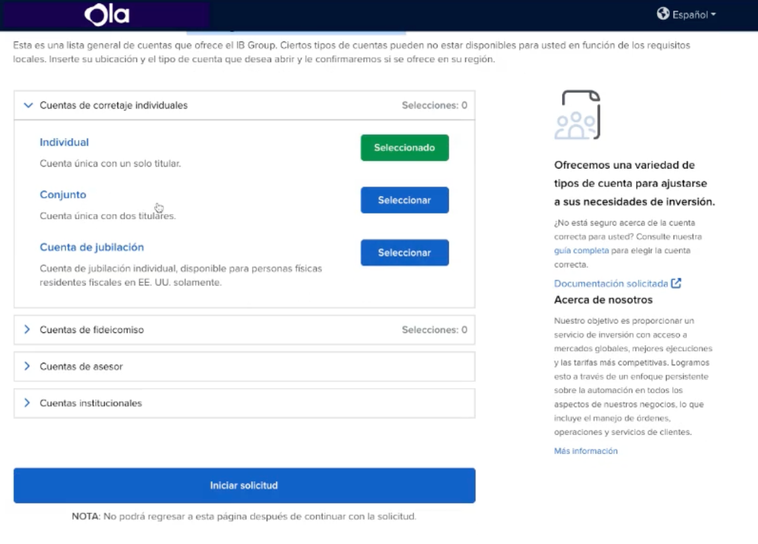 - Selecciona una cuenta de corretaje individual o en conjunto con otra persona.