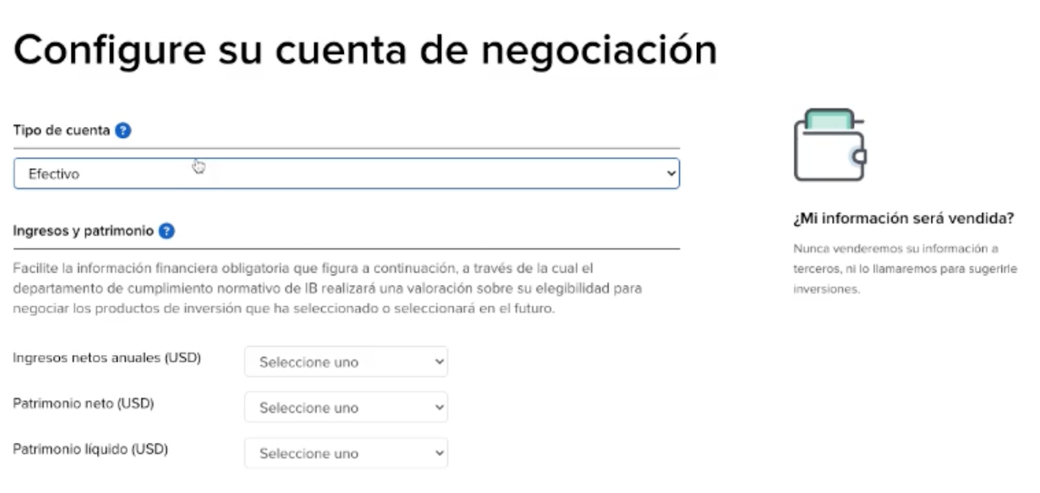 - Selecciona el tipo de cuenta. En el caso de que vayas a solo hacer inversiones a largo plazo, selecciona: Efectivo. Esto significa que no vas a pedir préstamos sobre tus inversiones, sino solo utilizar el dinero que tienes en efectivo en la cuenta.
