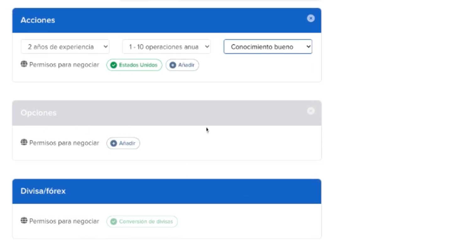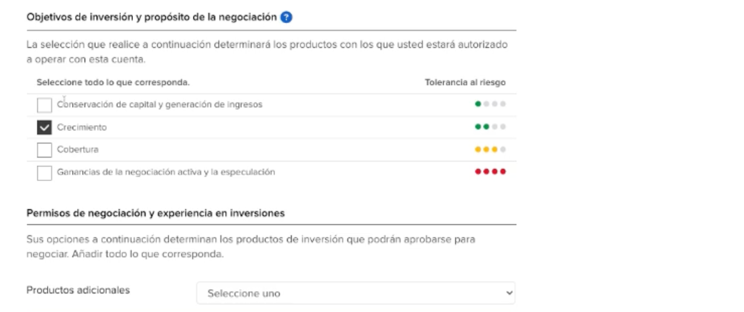 4. Si solo vas a invertir en acciones, no selecciones ningún producto adicional y deja ese campo en blanco.