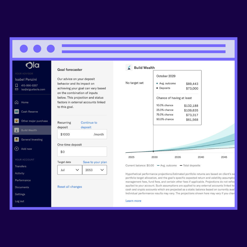 Ola fue creada para ayudarte a lograr todos tus objetivos financieros. Invierte con nuestros portafolios recomendados que se adaptan a tus necesidades individuales. Obtén acceso a través de una membresía Ola.